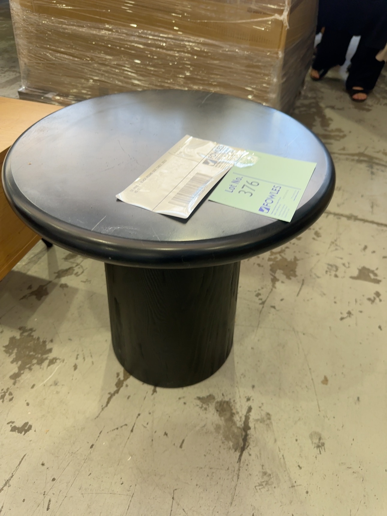 EX HIRE – INDUSTRIAL ROUND SIDE TABLE WITH TIMBER TOP AND METAL FRAME, SOLD AS IS