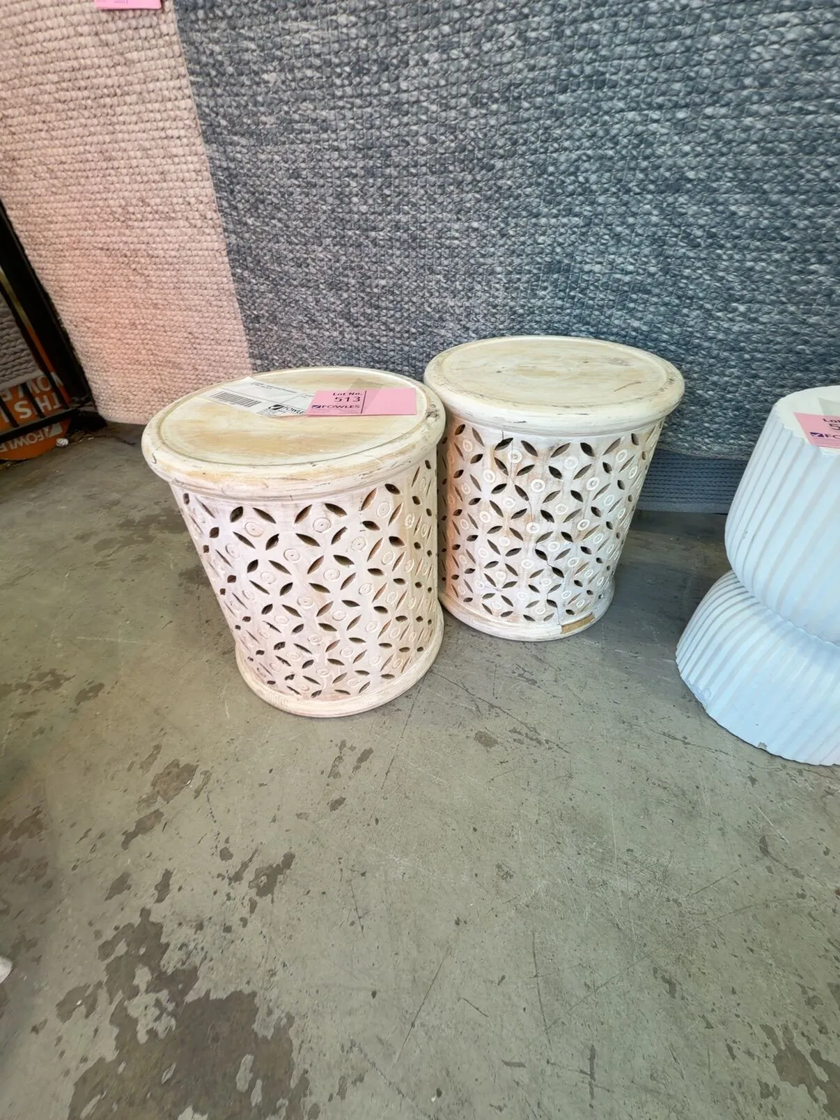 EX STAGING – ROUND CARVED WHITEWASHED SIDE TABLE, SOLD AS IS