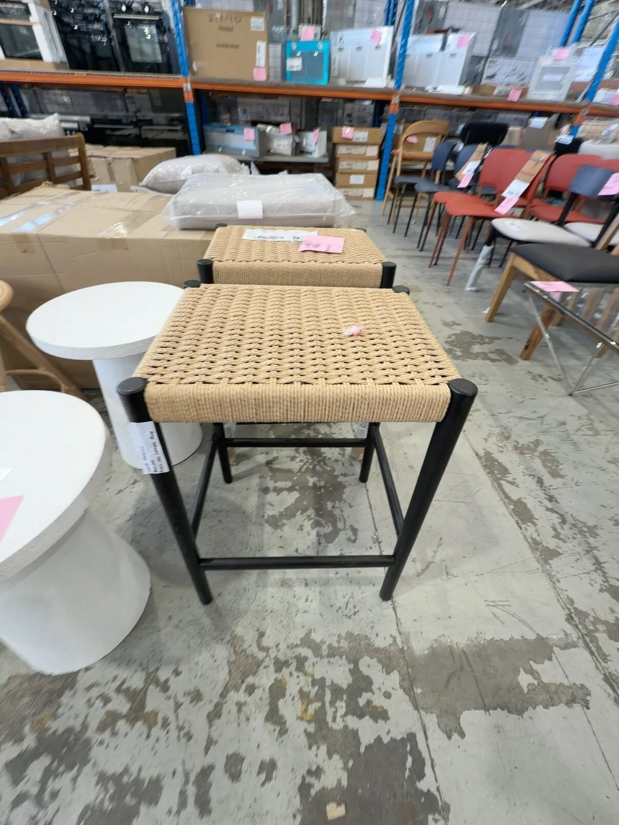 SAMPLE LORNA BAR STOOL, BACKLESS, BLACK OAK & ROPE SOLD AS IS