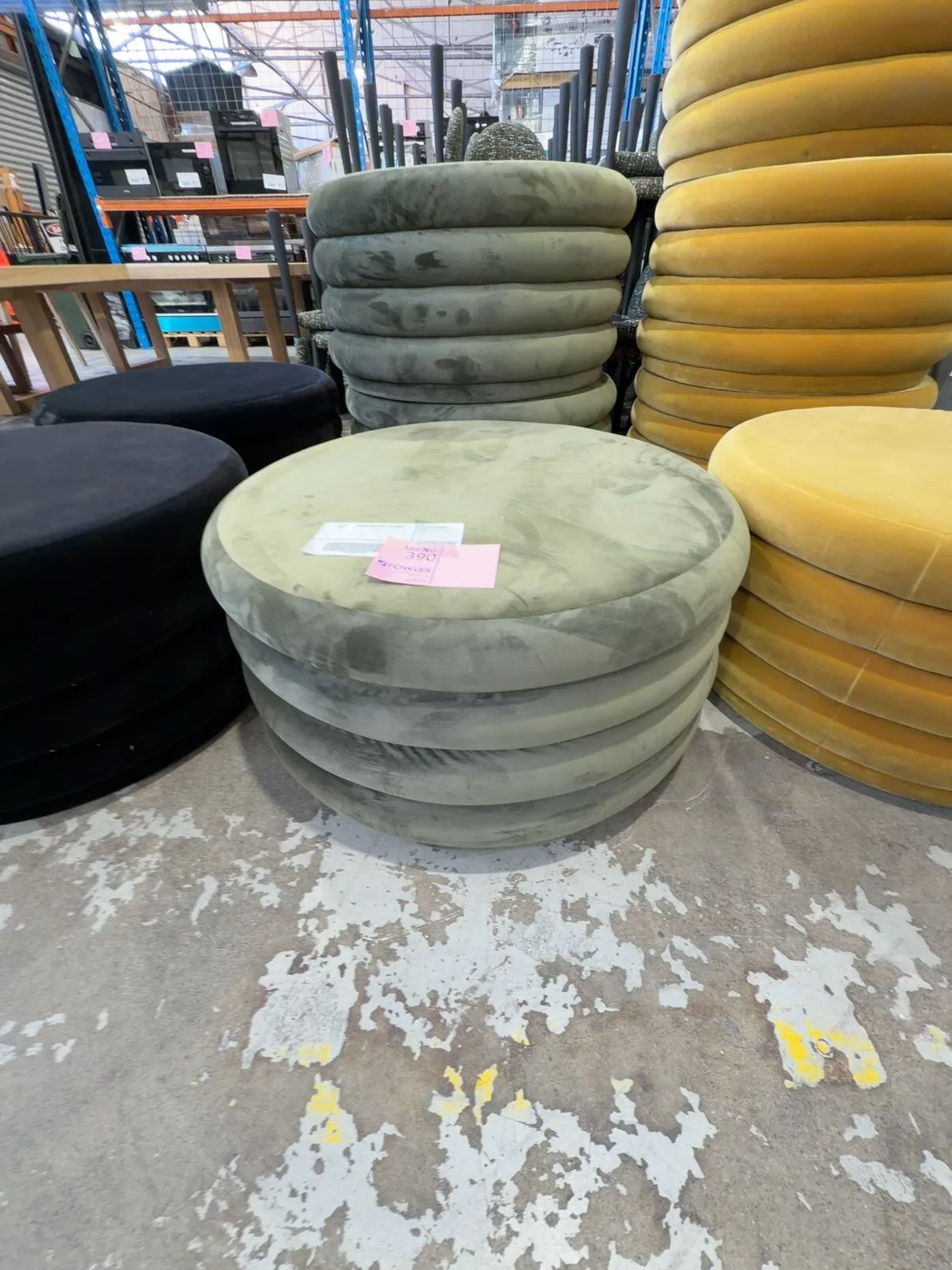 EX HIRE – ROUND GREEN VELVET OTTOMAN, SOLD AS IS